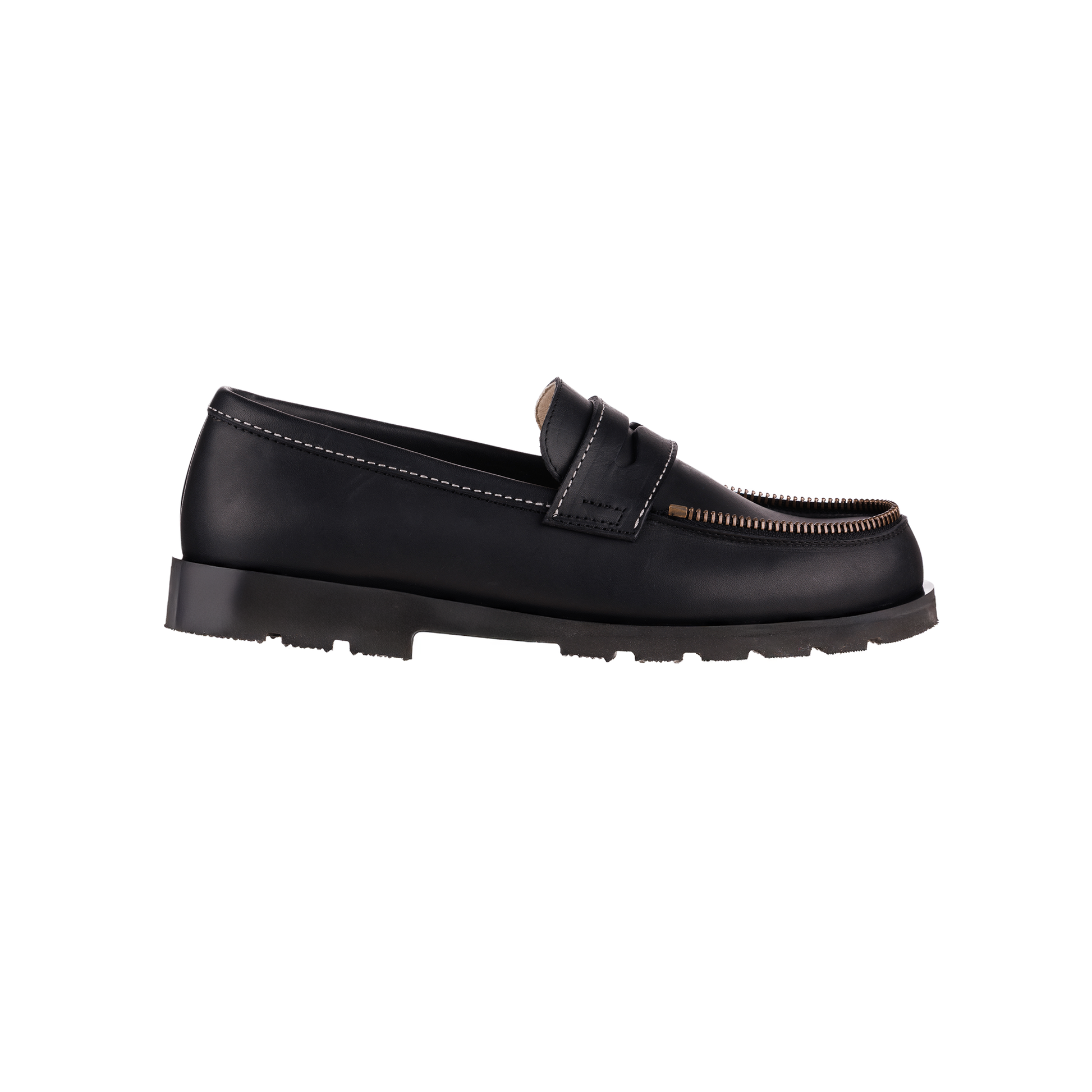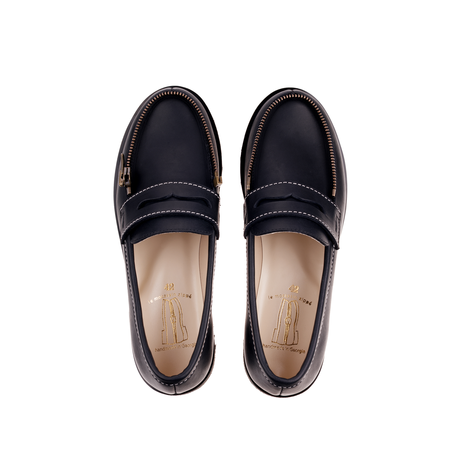 Crafted in Tbilisi, Georgia, these men’s moccasins combine matte black Italian calf leather, cream hand-stitching details, a dark brass zipper, beige leather lining, and a 100% natural rubber sole.