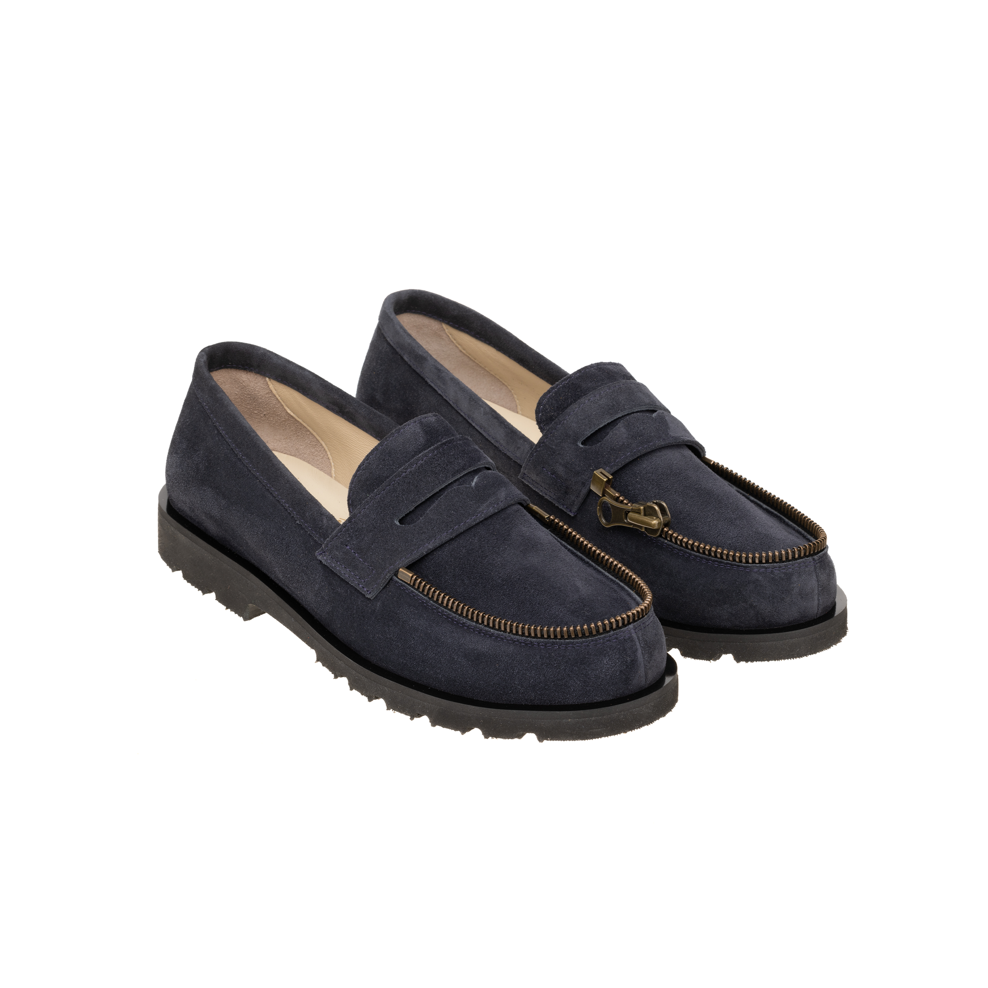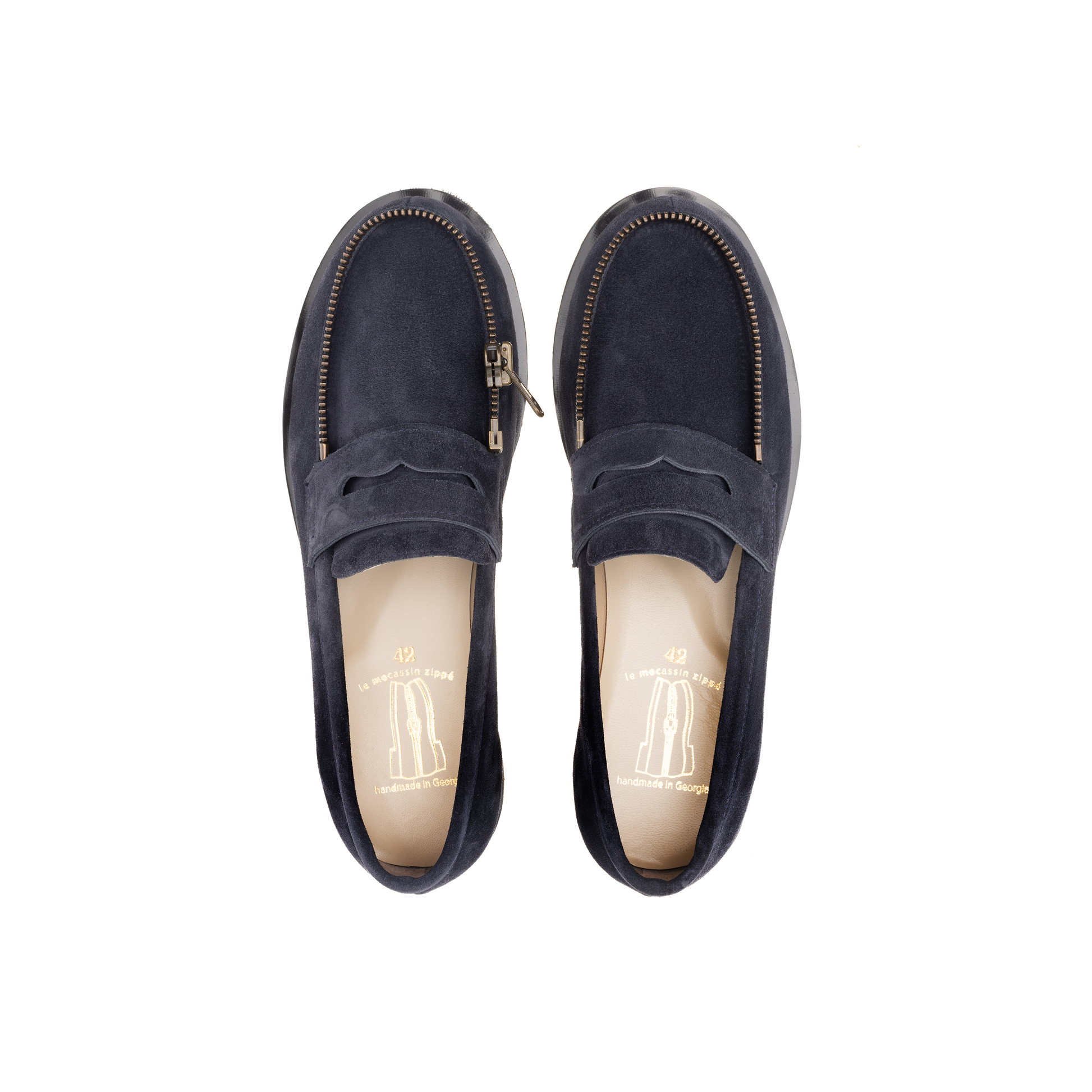 Crafted in Tbilisi, Georgia, these very soft and comfortable mocassins feature dark blue Italian suede, a dark brass zipper, beige leather lining, and a 100% natural rubber sole in black.
